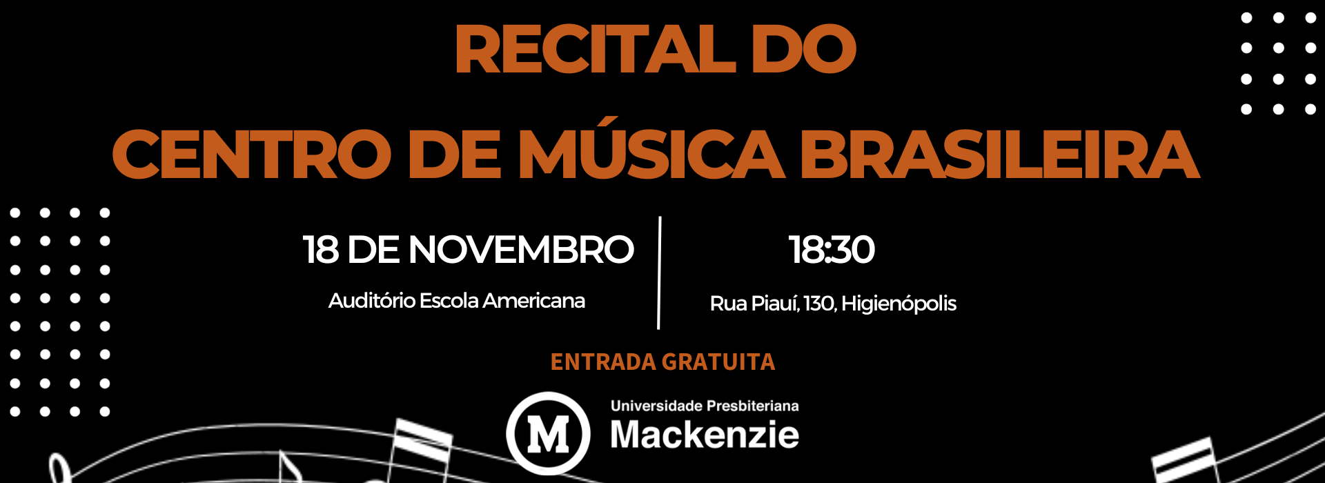 A Universidade Presbiteriana Mackenzie (UPM), por meio da Pró-Reitoria de Extensão e Cultura (PREC) e da Coordenadoria de Arte e Cultura (CAC), promoverá no próximo sábado, 18 de novembro, às 18h30, o Recital do Centro de Música Brasileira (CMB), no auditório Escola Americana, campus Higienópolis.