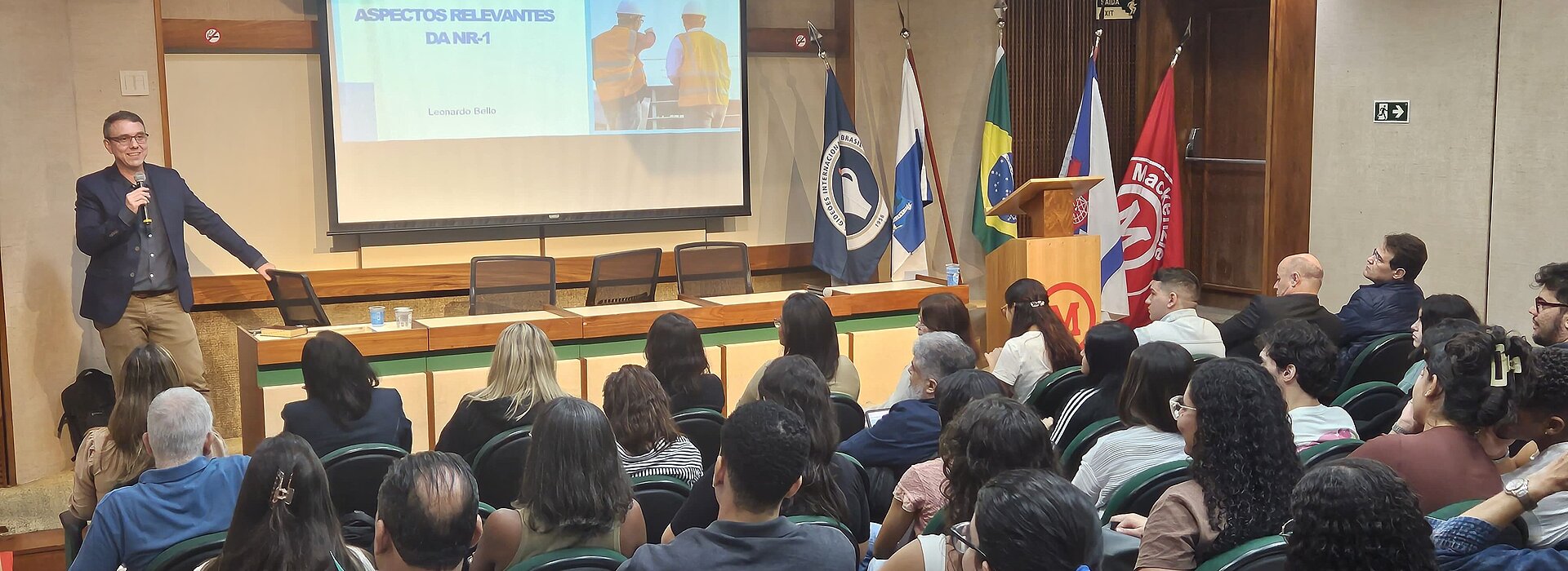 A Faculdade Presbiteriana Mackenzie Rio realizou na última quinta-feira, 22 de maio, um encontro com alunos de Psicologia e Direito para discutir sobre os Aspectos relevantes da NR-01. O palestrante convidado e auditor fiscal do trabalho, Leonardo Bello, falou a respeito da atualização da Norma Regulamentadora NR-1, que estabelece diretrizes gerais para as demais normas de segurança e saúde no trabalho.